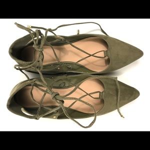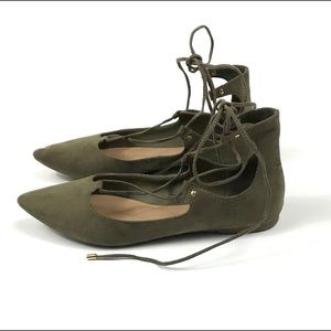 Olive Green Old Navy Lace Up Ballet Flat- size 9. Like new. No flaws. Looks great with cropped jeans, skirts, dresses and canvas shorts. First pic is just to show how laces up, other pics are actual shoe.
