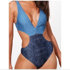 new without tags β¨ recently purchased for vacation, but never got to wear β’ size small/US 4 β’ one piece, medium wash top + dark wash style bottom β’ traditional swimwear material, not actual denim!