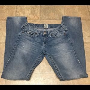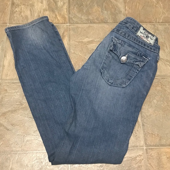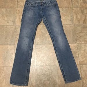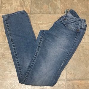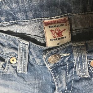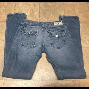 Belt loops, zip fly with button closure, five pocket style, pull on style and fit. 99% Cotton 1% Spandex