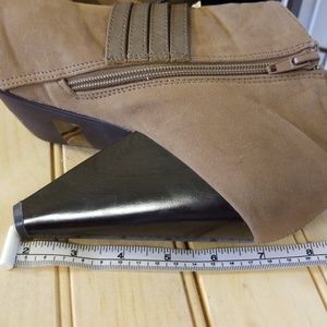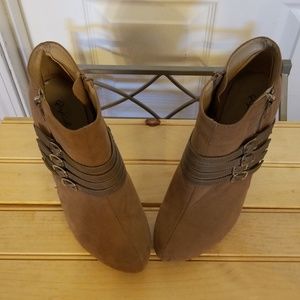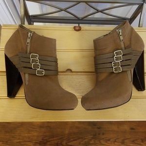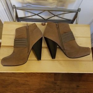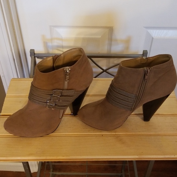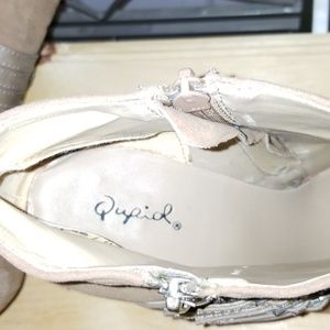 Very adorable like new Qupid tan suede heeled booties size 8 1/2 women's. Only gently worn once, decorated with adjustable straps and zippers on both sides