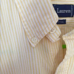 A classic, yellow and white, striped button down shirt by Ralph Lauren. Features a unique Polo logo design by the left side of the chest. Perfect for any time of year, as it can be worn casually or as part of a more formal outfit. In very good condition overall with two small flaws. One barely noticeable mark by the elbow and another by the chest. Both are unnoticeable while the shirt is being worn. Neck size: 16 1/2 Body size: 33