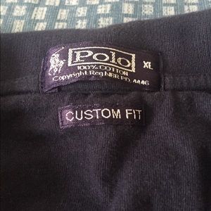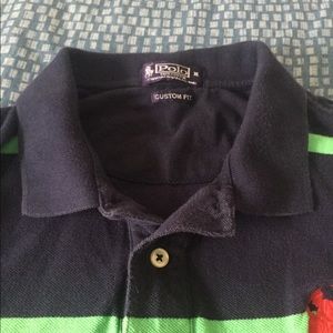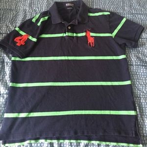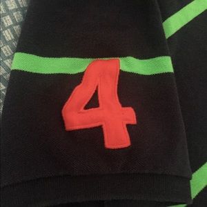 A beautiful navy blue, lime green, and red polo shirt. Features horizontal stripes all along the shirt, a large embroidered Polo logo on the left side of the chest, and an embroidered number 4 on the right sleeve. 9/10 condition. Size says XL but fits more like a Medium.