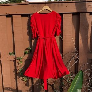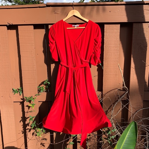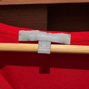 A gorgeous red dress from NY Collection. The sleeves are delicately puffed, and the top is slightly layered. This ties in the front. A wonderful dress for a holiday or a Christmas party!