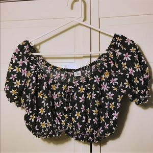 Black crop top with pink and yellow flowers - front and back are the same - tassels in the back - not worn twice- price negotiable