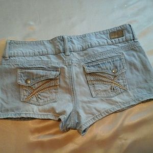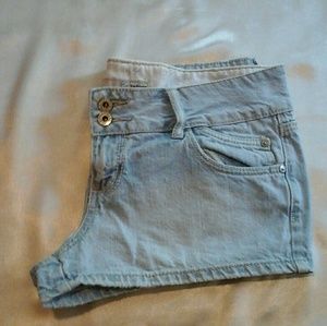 Size 9 light wash distressed denim. Last photo show 2 small holes but they look to be part of the design. Two button closure and back pockets button as well. Booty shorts as I call them, very short! Anything else just ask!