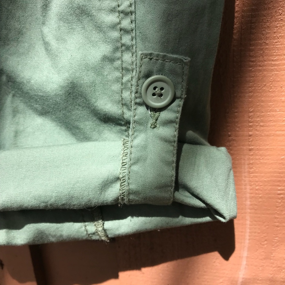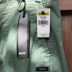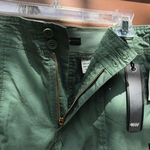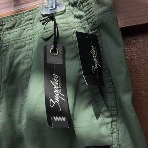 A brand new pair of green cargo shorts from Supplies. The bottom of each leg can be rolled up and buttoned. There is also a bow on the bottom of each leg to tighten/loosen the bottom hem. Contains velcro pockets. Has all of it’s tags, and even the sizing sticker.