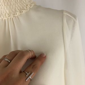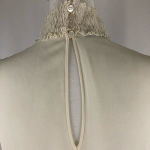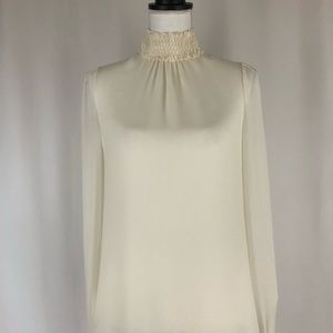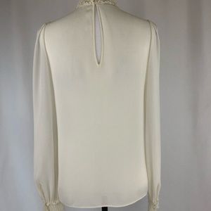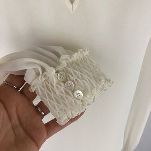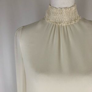 High neck Victorian style ivory silk blouse by Valentino. Size 2. TTS. Smocked / pin-tucked neckline and cuffs with ruffle detail. Amazing blouse that can be dressed up or down. Has one very tiny spot in front that’s hardly noticeable even when pointed out and a tiny pull in the back near the bottom hem. See photos. Bundle to save.