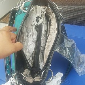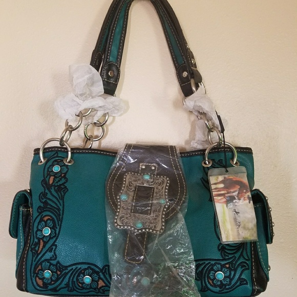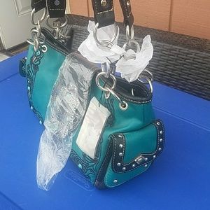 turquoise color with a concho belt with turquoise stones(not sure if real) embroidered flowers along from of purse