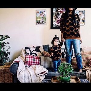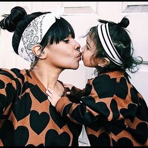 Mother daughter/son twinning sweatshirts. Brand Hugo Loves Tiki. Brown with black hearts.