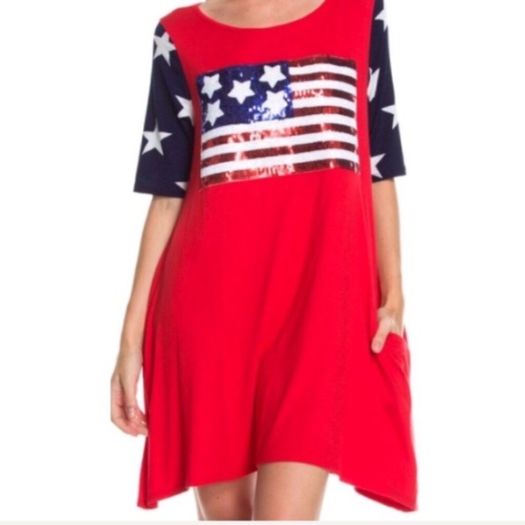 Red swing dress with * Pockets *. Loose oversized fit. Star print sleeves. Sequin flag on chest. Perfect for the 4th of July.