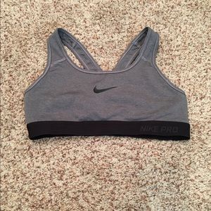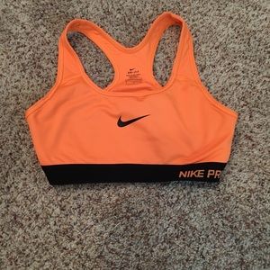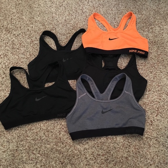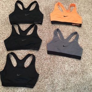 3 black Nike Pro sports bras, 1 grey, and 1 neon orange! All are a size small and in excellent condition! Perfect for a run or a day at the gym! I’m also willing to sell them individually! :)