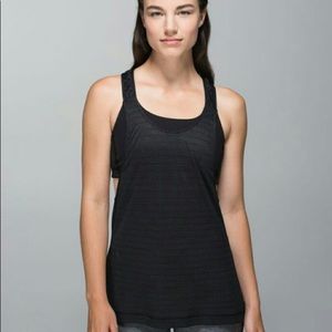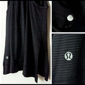 Stash your bra and hit the ground running! This tank has a shelf-bra with pockets to hold lip balm, money, keys, etc. Lightweight and breathable mesh body. Open back and low armholes help you catch a breeze. Slits on sides can be tied for a snug fit at the hip. Black with small gold threading. Size 6.