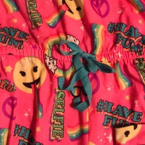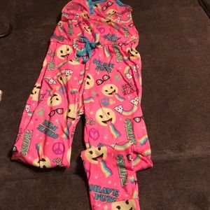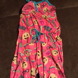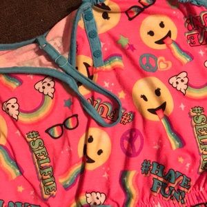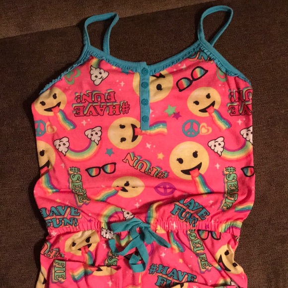 In excellent condition. Girls Justice size 10 Emoji Adorable One Piece Pajamas. It has adjustable spaghetti straps & a stretchy waist band with tie. This is a full one piece Pajamas. Absolutely Adorable for your Girl!! ๐๐๐๐