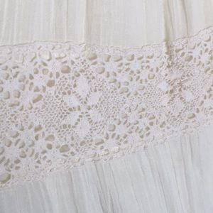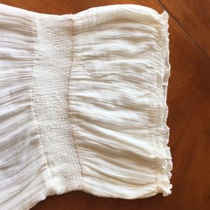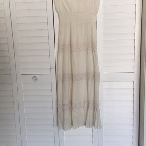A lightly fitted strapless maxi dress with lace trim detail. Great for summer beach days