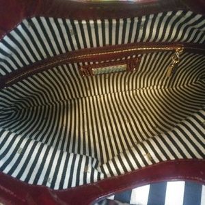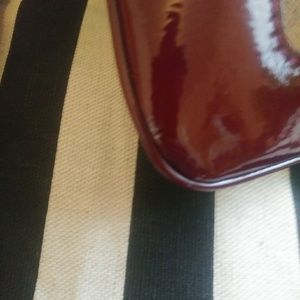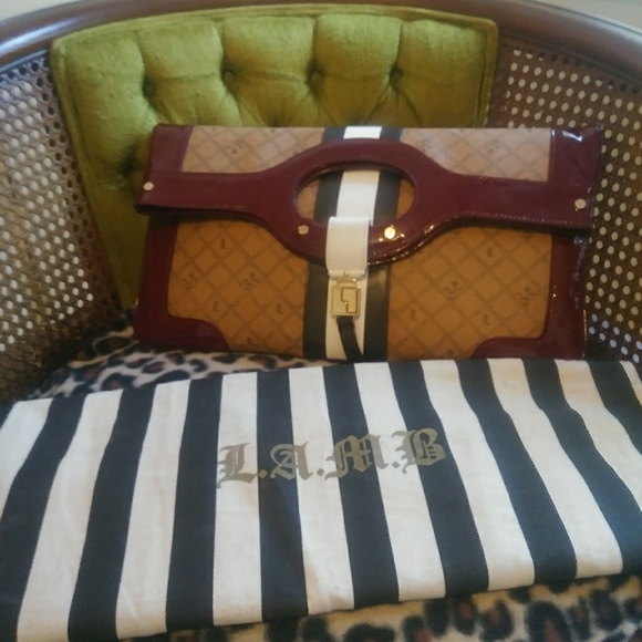 L.A.M.B lipstick carlisle convertible clutch. In excellent used condition! Such a beaut!!! Maroon patent leather with a coated canvas tan and black print. Black and white leather strip down the middle. Gold hardware with nary a scratch. There are a couple imperfections but only noticible if you are super close and looking for them. White scuffs on the corners and 2 tiny scuffs on the leather strip. I haven't tried removing them so who knows!! Approx 16x9in as a clutch.