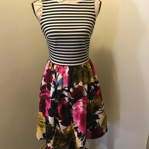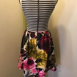 Adorable striped and floral fit and flair dress by Taylor. . Size 2. Black/white striped top and multi-colored floral print skirt in scuba-like material. Super comfy & it has pockets! Worn only a couple of times. 35” length. When flat: 16” armpit to armpit & 13.5” Waist.
