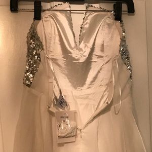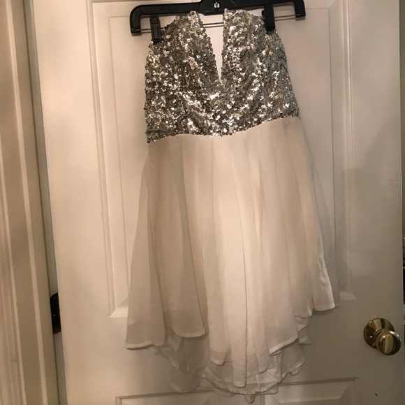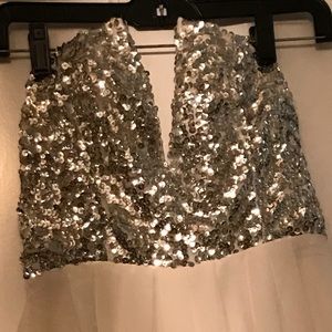 V-cut strapless sequin dress, v-cut is supported with wire and rubber strips to keep from falling, back zip closure