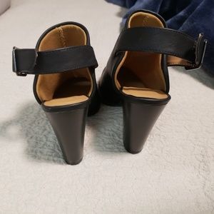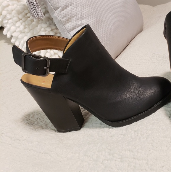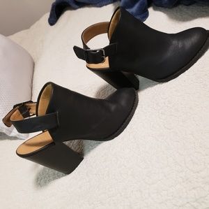 Black open back strap booties.Worn a couple times have a few scratches but in great condition.