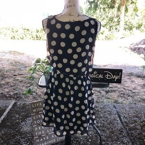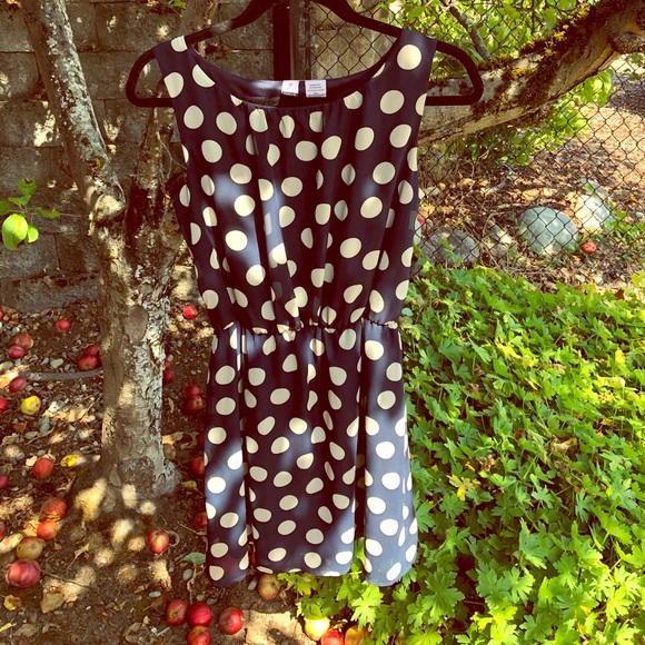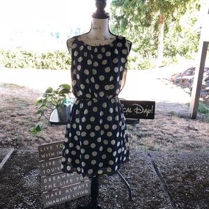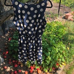 Sleeveless navy dress with cream polka dots. A little above knee length. Have only worn a few times. Very classy! A kind of light chiffon fabric☺️