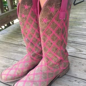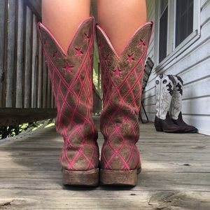 Size 8, these babies have seen life but still look good with a pair of boot cut jeans!