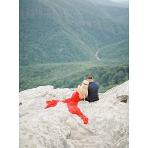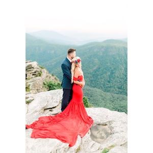 Absolutely breathtaking red off the shoulder gown with stunning train. Dress is a size small. I only wore this dress for ONE hour! Absolutely nothing wrong with it!!! Comes from a smoke free home, and I will ship it out right away for you. I paid $300 for this beauty. ♥️😍