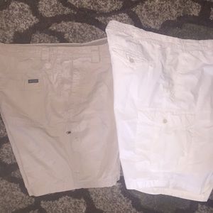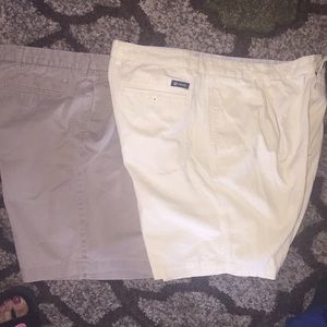 All are in excellent condition! Chaps(yellow),saltwater chinos(tan)field and stream(lightest tan)they are cargo shorts.also Dockers(grey),cargo style Columbia tan shorts and whitest white Izod cargo style shorts!!!great deal!!!sell separate for 10