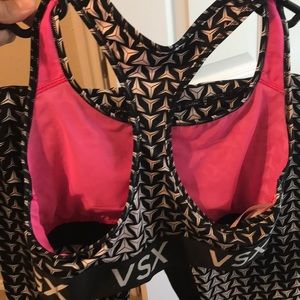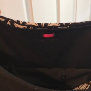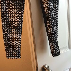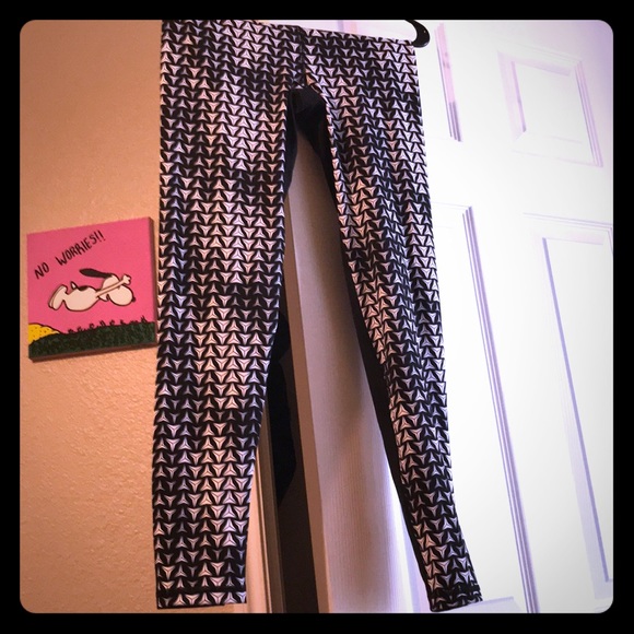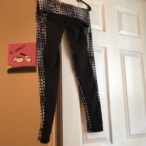 Spandex, and are the tights style. The pants hit all the way to the ankle. Barely worn. Maybe wore 5 times all together. Willing to sell the bra separate but prefer to sell the set.