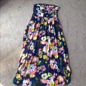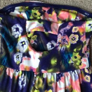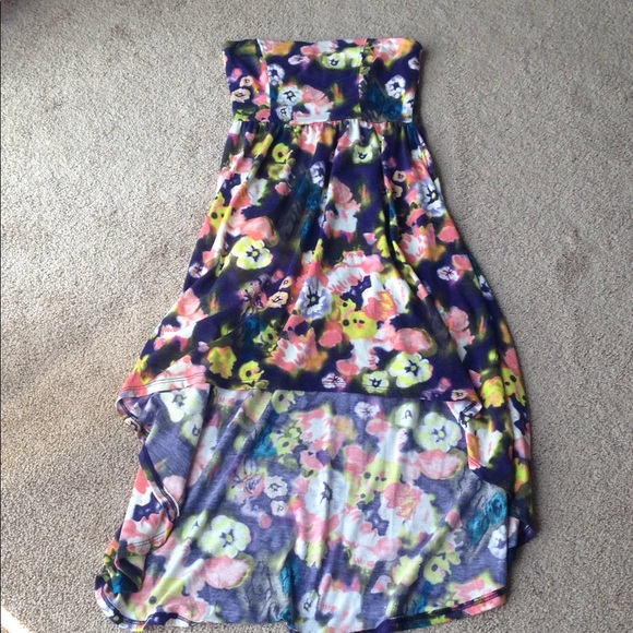 Very cute strapless flowery dress. Longer in the back as seen in photos. Elastic to help hold up the top.