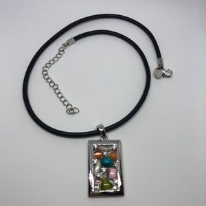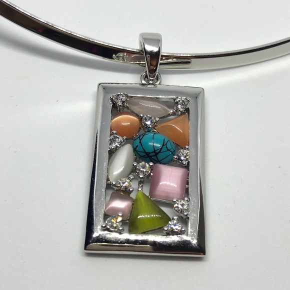 This pendant slide is made of Rhodium plated silver with Genuine Turquoise & multicolored Cut Crystals. Use with your favorite chain necklaces or other Lia Sophia necklaces.