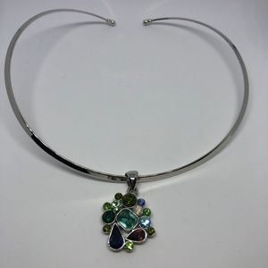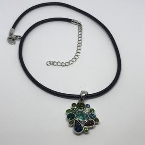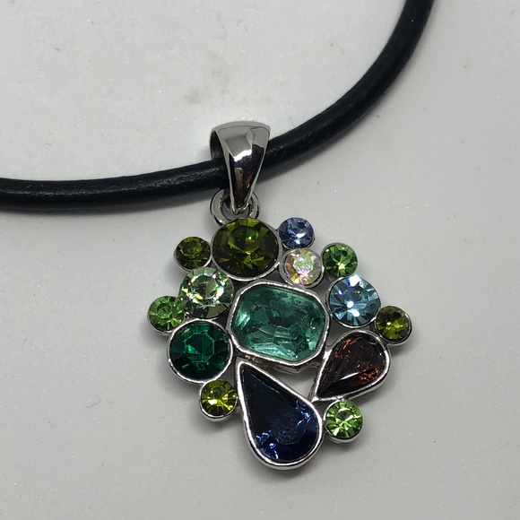 Pendant is made with green, blue and brown crystals and Rhodium plated silvertone background. It is about 1 1/4 inches long. Never worn, only used for jewelry shows. Brand new w/out original box and tag.