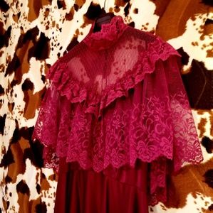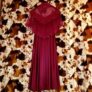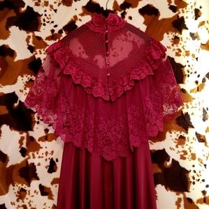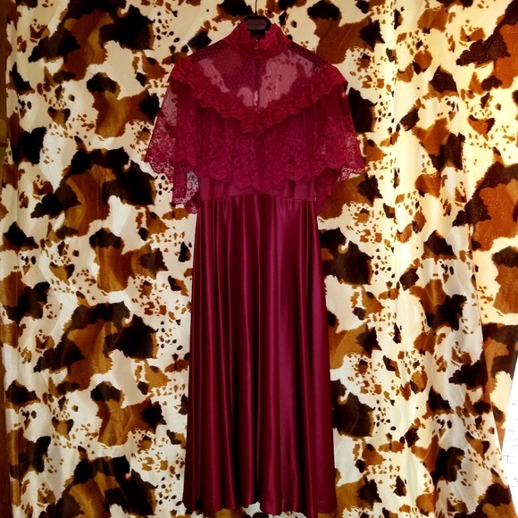 Channel your inner Jackie Burkhart in this incredible vintage cranberry disco midi dress! This one's a total gem!! It features a high neck, sheer lace top layer, flouncy lace sleeves, zippered back, little pearlized buttons and an oh so figure-flattering A-line skirt! 100% polyester and made by JC Penney Fashions! Wear with a fab pair of gold chunky platforms for an utterly groovy ensemble and rock it like nobody's business! Will best fit a S/M, in pristine vintage condition! ☮❤😁