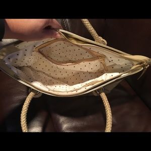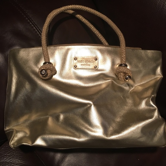 New condition without tags. Gold Kate spade tote with adorable rope handles! Even the inside is spotless!! Such a fun bag!! Measurements: width 16”, height 10 1/2”
