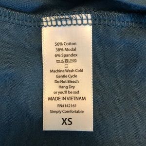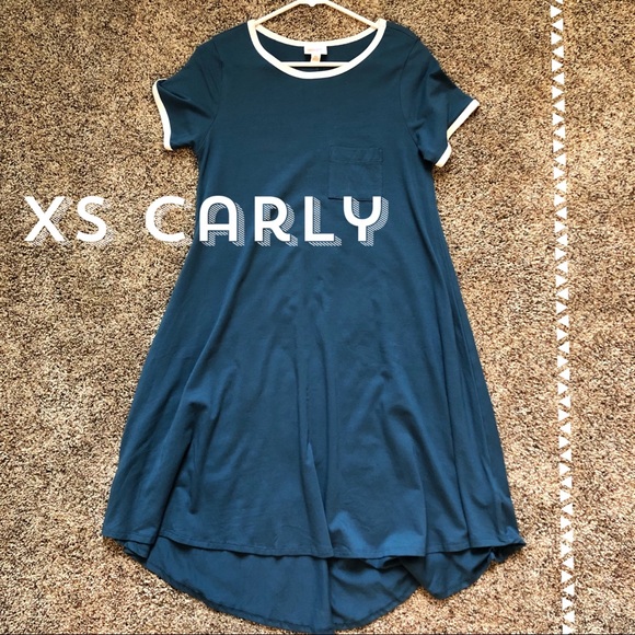 NWOT. XXS blue Carly dress with white trim. Can be worn alone or with leggings, by itself or under a long cardigan! VERY versatile! Great stretch, fabric makeup shown in photos.