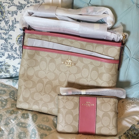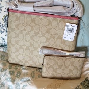 NWT!! Coach khaki coated canvas crossbody with mauve trim and matching wristlet. Sold as a set.