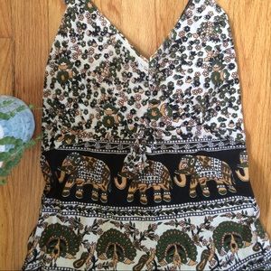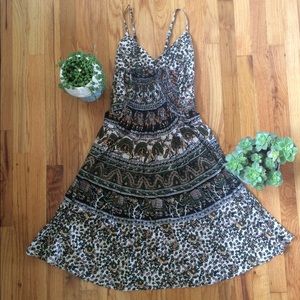 Beautiful tapestry print dress that is very comfortable. Soft fabric and has a totally stretchy back so while this is a size M, it can fit a smaller or slightly larger person! It has a tie in the front just under the bust for even more adjustability. Straps are also adjustable for length. No damage whatsoever! Thanks for looking, and happy shopping! :)