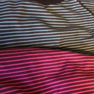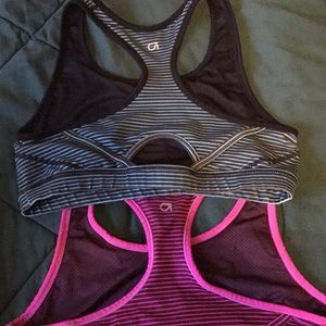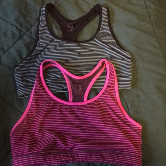 2 unpadded stripped sports bras from Gap. One is pink and the other is turquoise.