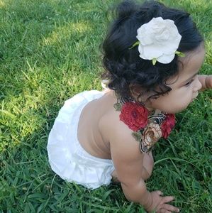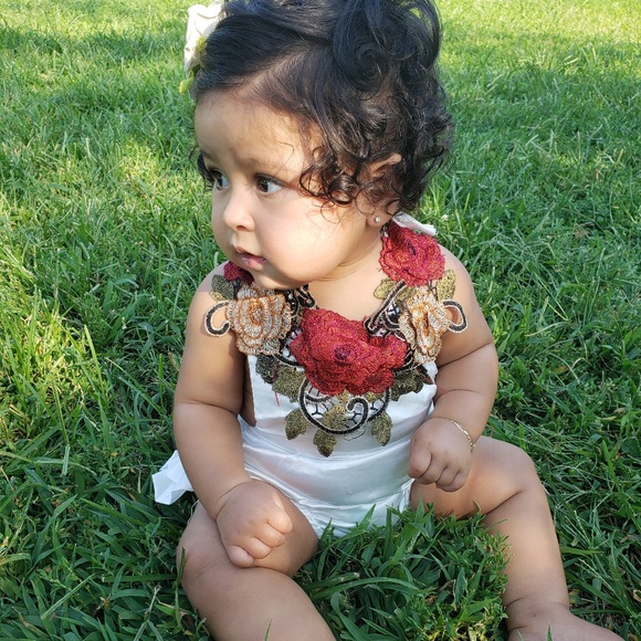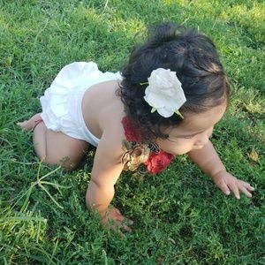 This is a white backless romper with flower details around the collar, it ties behind the back,its a silky material ,so soft ,it has ruffles on the butt part,worn once for pictures ,size says 80 which is like 12 months US sizing , my munchkin is 8 months but 23 lbs and it fit her well