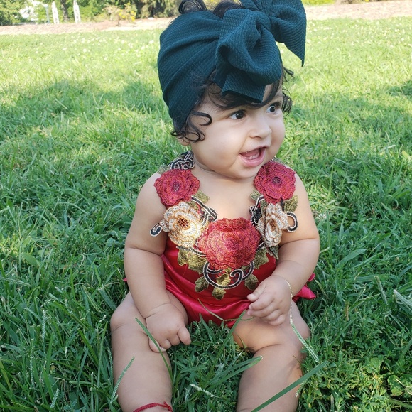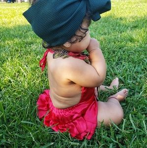 It's a red backless romper, with rose flower detail around the collar ,it ties in the back,its a silky material, so soft and comfy, has ruffle detail on the butt, worn once for pictures ,size says 80 which is the same as 12 months ,my munchkin is 8 months but is 23 lbs and it fits her good