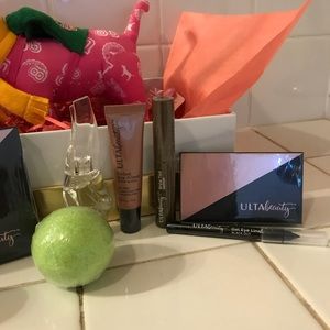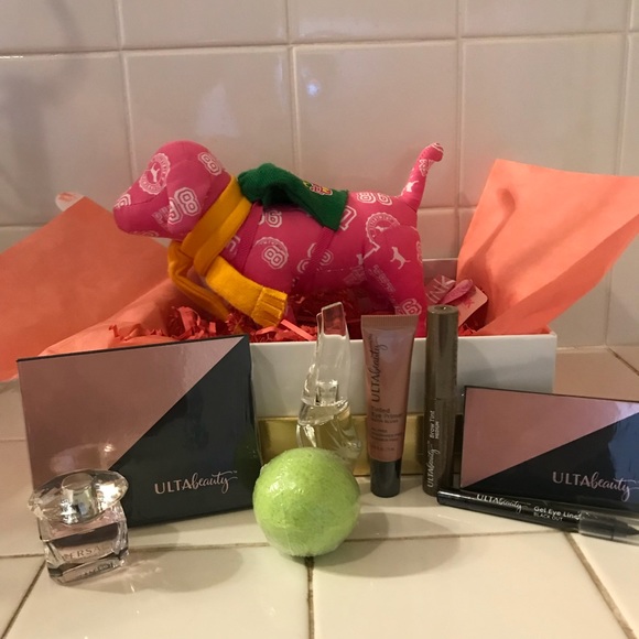 2 Versace bright crystals. Bath bomb and eyeshadow and blush palette and A Pink Dog plush! All in An adorable gold and white gift box.