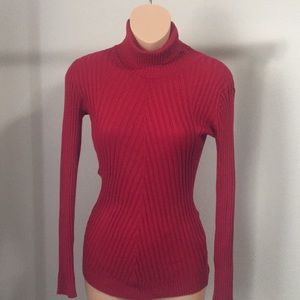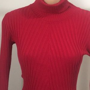 Bright red turtle neck! Great for holidays and comfy layered or with a blazer. Two small snags on the back side.