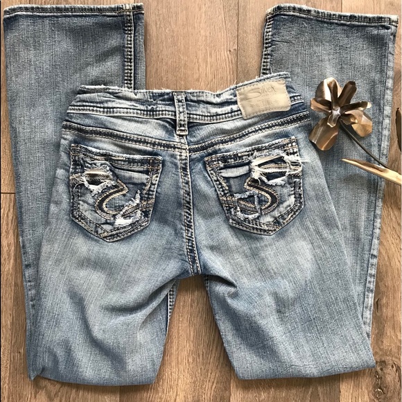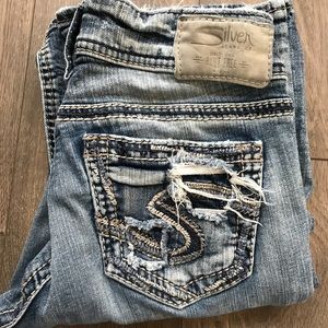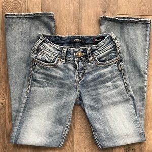 Suki Silvers with a boot cut style and light blue wash. Size 24 with a 31” inseam.