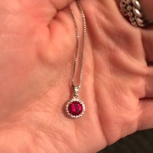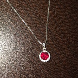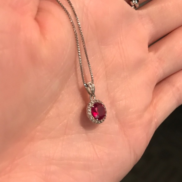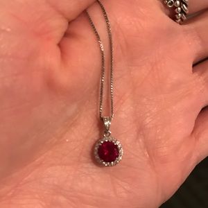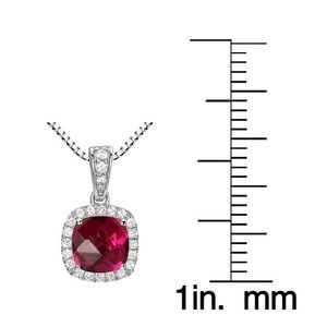 Ruby and white sapphire cushion-cut halo pendant necklace. In perfect condition! Here’s the details: