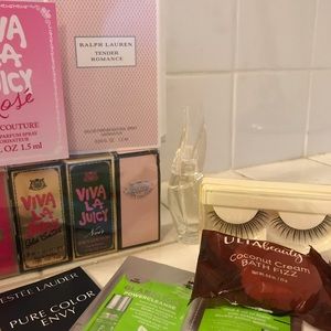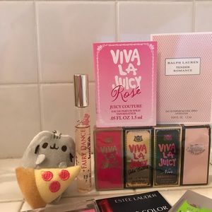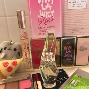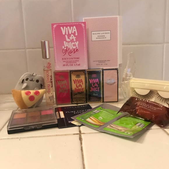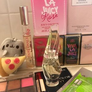 Cashmere mist, viva la juicy, juicy couture, gold couture and Noir! Pusheen keychain. Almost full Ana Sui Fairy Dance, lightly used eyeshadow palette, lashes, bath fizzy, tender romance and viva la juicy Rosé