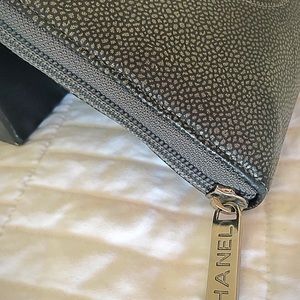 Features one of a kind printed metallic silver and black caviar leather, a large frontal quilted CC logo and silver hardware. The interior features silver leather with multiple billfold compartments, a zippered coin section and 19 card slots. This stylish wallet is both chic and functional and will be an excellent everyday wallet/organizer or evening clutch. In great condition, very gently used with very small visible signs of wear inside (see pics).