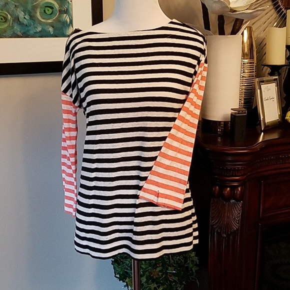 Strip lightweight cotton quarter length sleeves zipper up right shoulder. Very cute barely worn. Length 24 in . sleeve 14. 18 cross bust