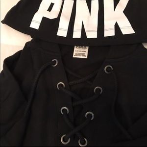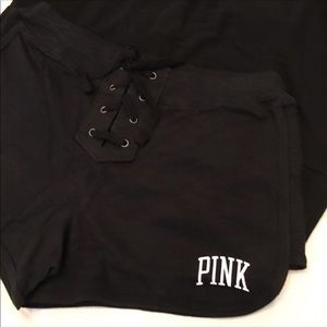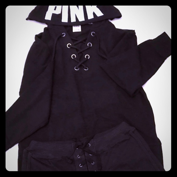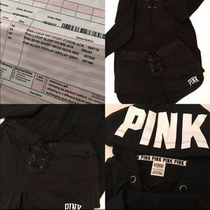 Sold out on the Victoria's Secret site, BRAND NEW only taken out for pics, this XSmall PINK outfit is not only stunning, but ALL occasion worthy with the corset style Lace up, a classic black hoodie covered in huge white Pink on top with a white smaller pink logo to match on the SHORT shorts, and so dynamic for some R&R or play! This set were the last two in their size!