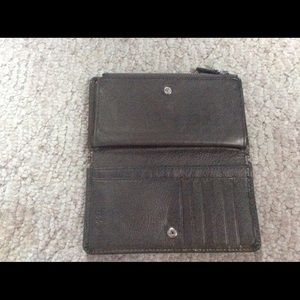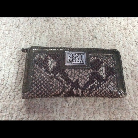Grey with snake print on the front and back of the wallet. It has a ton of card and bill slots! There is a bit a visible wear on the metal symbol, on the front of the wallet.