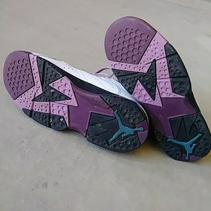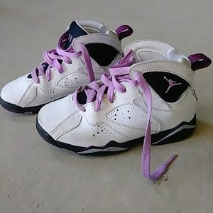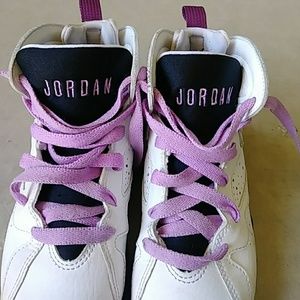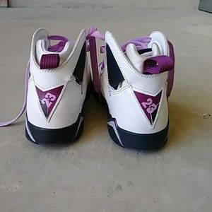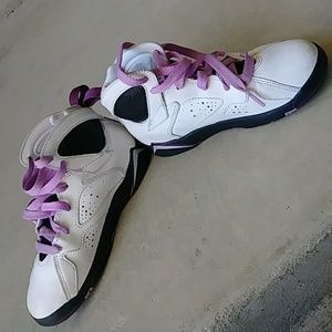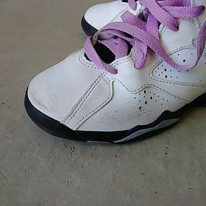 "Air Jordan 7 Preschool Girls Lifestyle Shoe features a mixture of tumbled and smooth white leather on the upper along with fuchsia glow accents that further the feminine aura surrounding the shoe. Release Oct 17 2015." (copied from shoe palace. com)