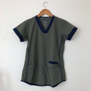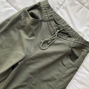 Top has a small faded stain (see second to last picture) but not noticeable when worn. Pants have very small fraying at the bottom (see last picture) but still in great condition.