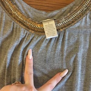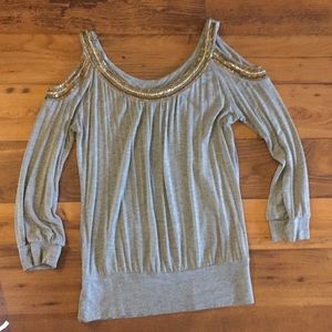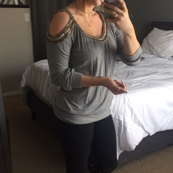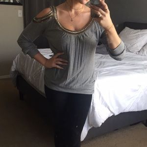 Grey long sleeve cut out top! Very cute with a pair of black pants. VERY small stain at top (pictured). Size Small!